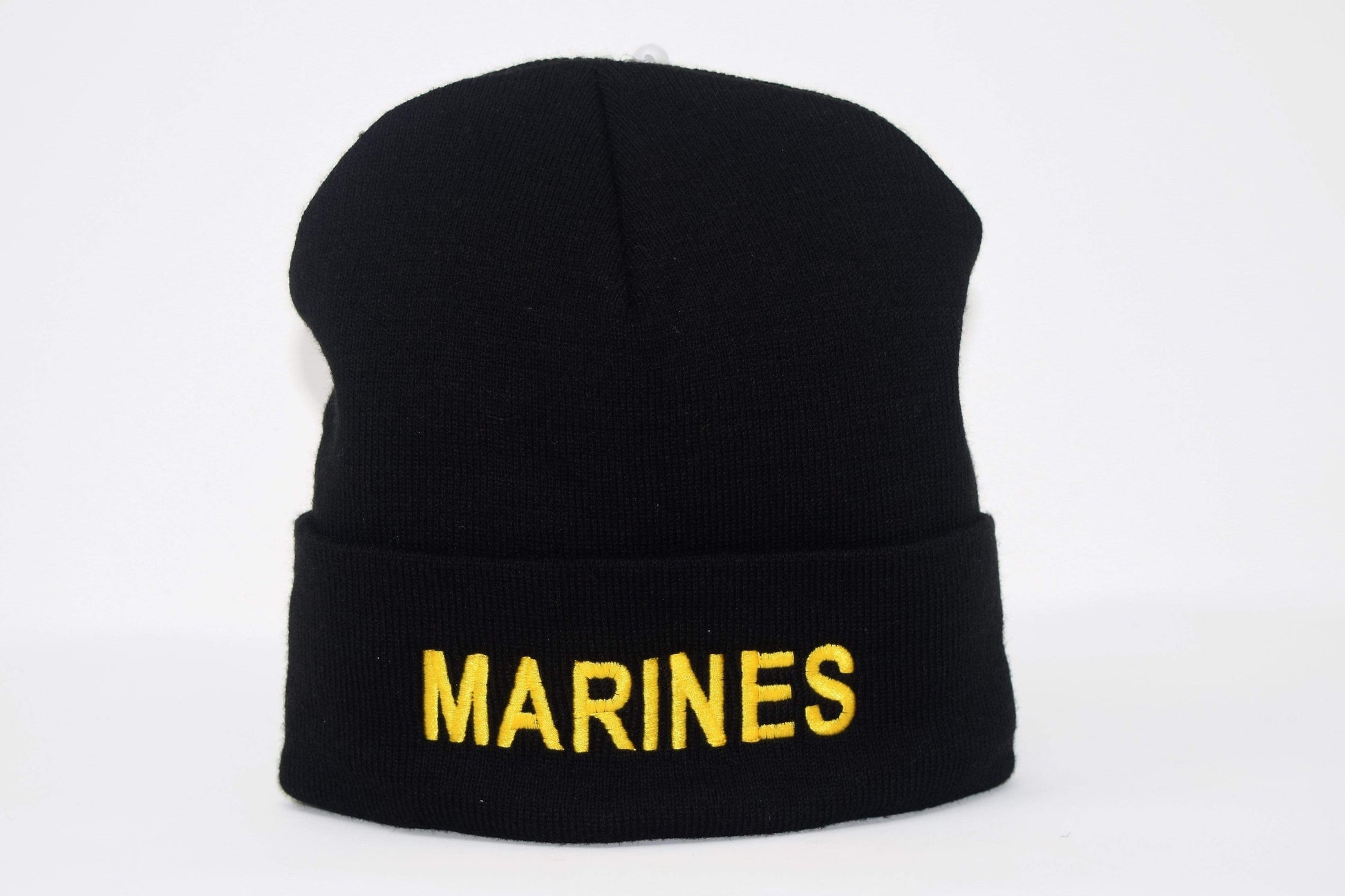 This knit "rimmed" beanie with features "MARINES" embroidered in gold. Order this one size fits all black Marine Corps beanie here.