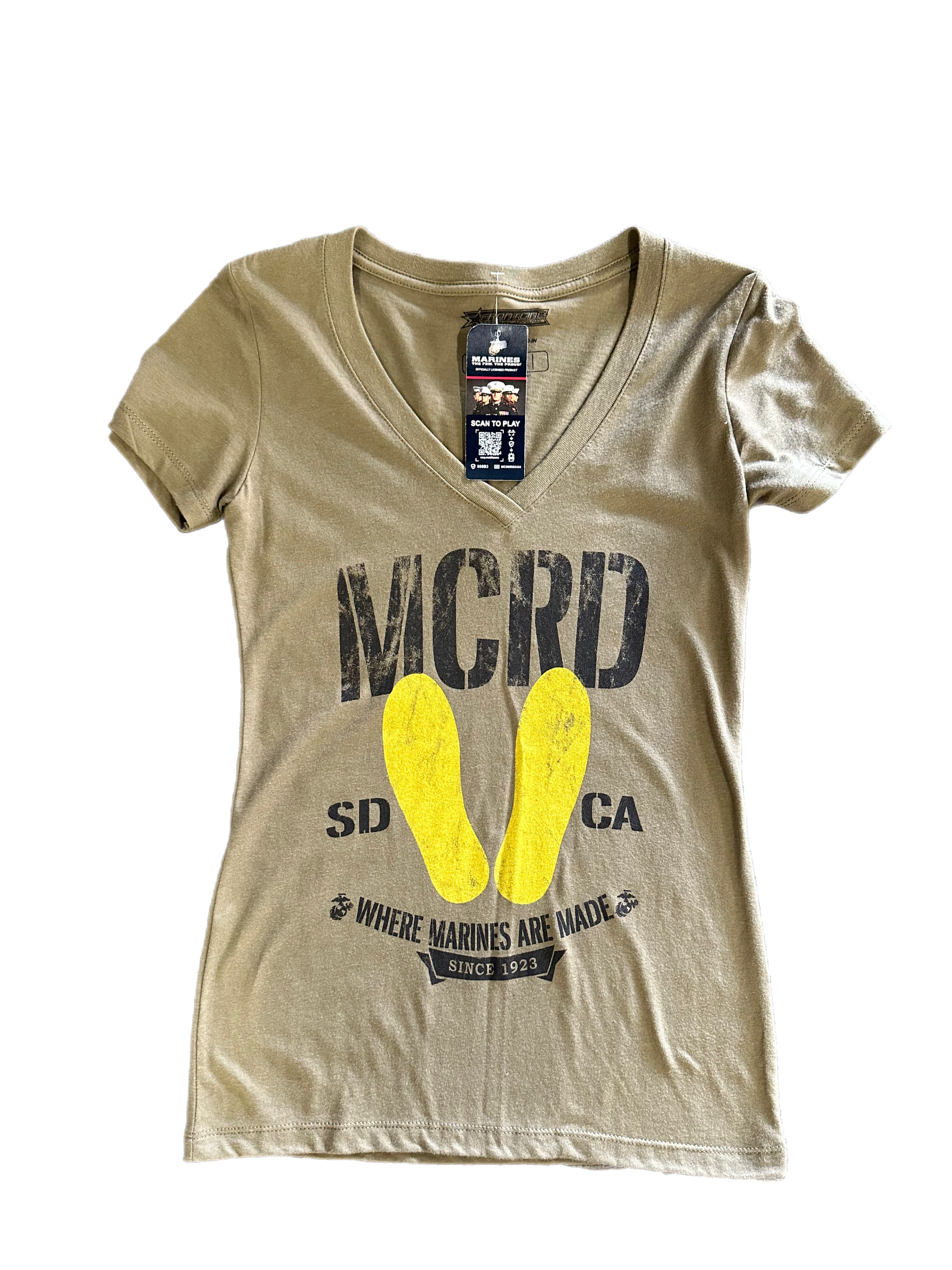 Lightweight and comfortable, this green MCRD San Diego shirt features the iconic Yellow Footprints that every new recruit stands on when they begin their boot camp journey. Purchase this Yellow Footprints v-neck today!