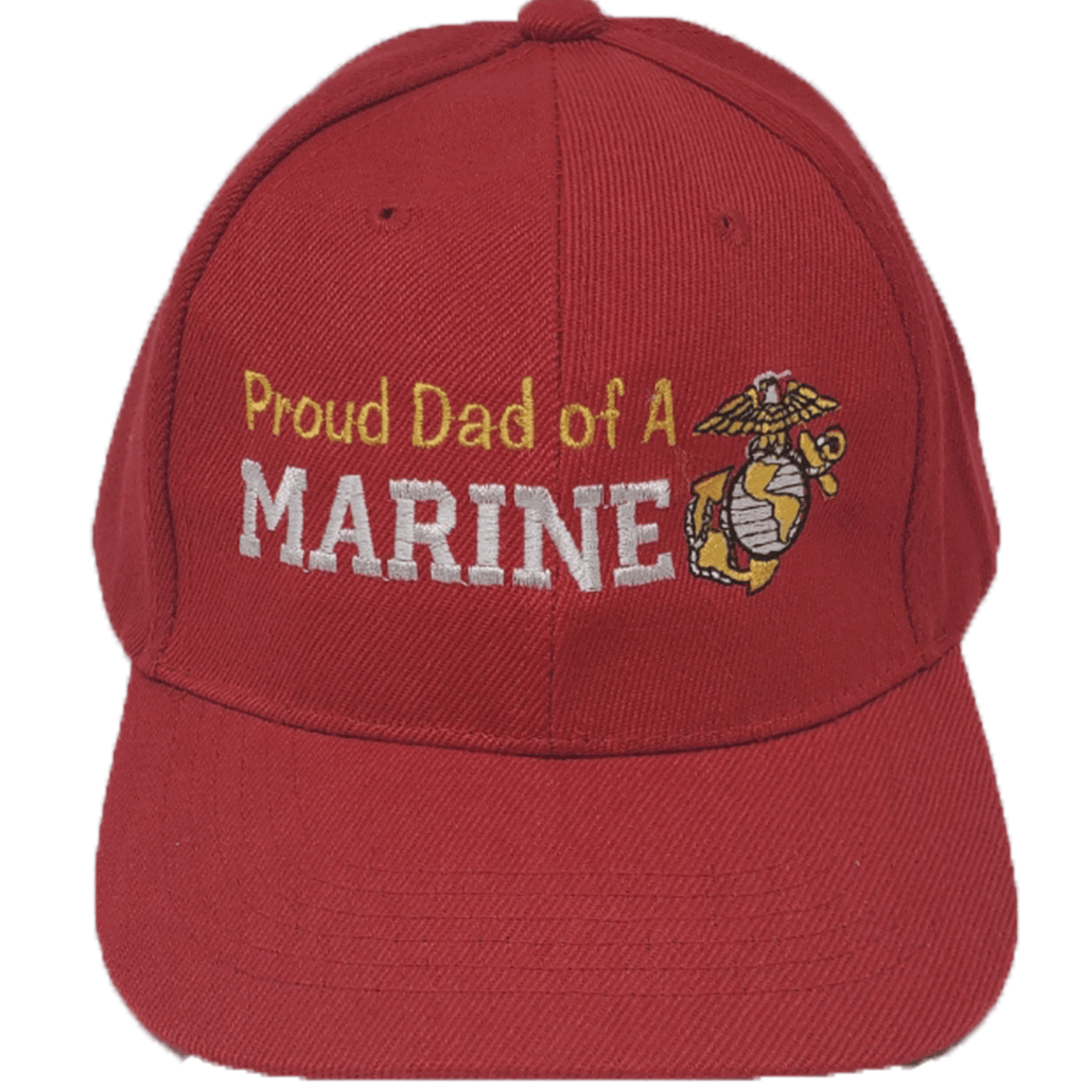 The red hat has "Proud Marine of A Marine" embroidered in light gold/white with a gold EGA emblem embroidered beside the lettering.